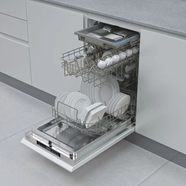 Et avec son 3ᵉ tiroir à couverts dédié, vous bénéficiez d’un espace supplémentaire pour vos couverts, louches et petits ustensiles, tout en libérant de la place dans les paniers inférieurs.